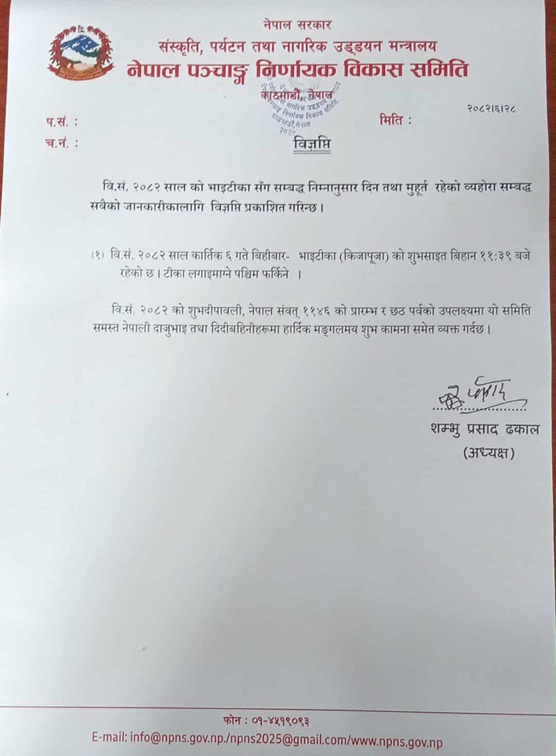 काठमाण्डौ । यस वर्षको भाइटीकाको उत्तम साइत सार्वजनिक भएको छ ।