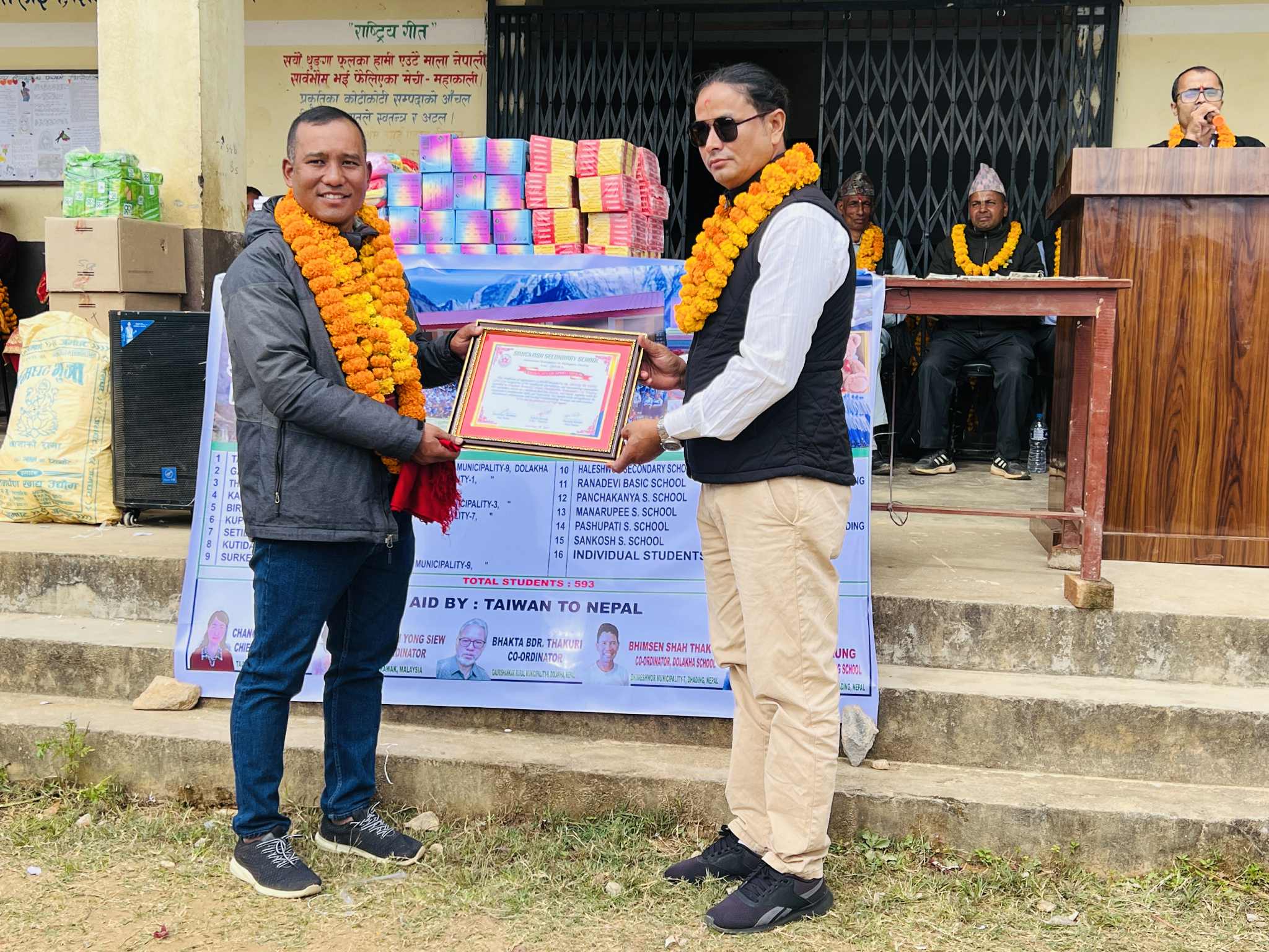 कार्यक्रममा विद्यालय व्यवस्थापन समितिका अध्यक्ष राकेश धमलाले ताइवानी र मलेसियाली नागरिकको प्रशंसापत्र विशेष अतिथि राजु गुरुङलाई हस्तान्तरण गर्नुभएको थियो।