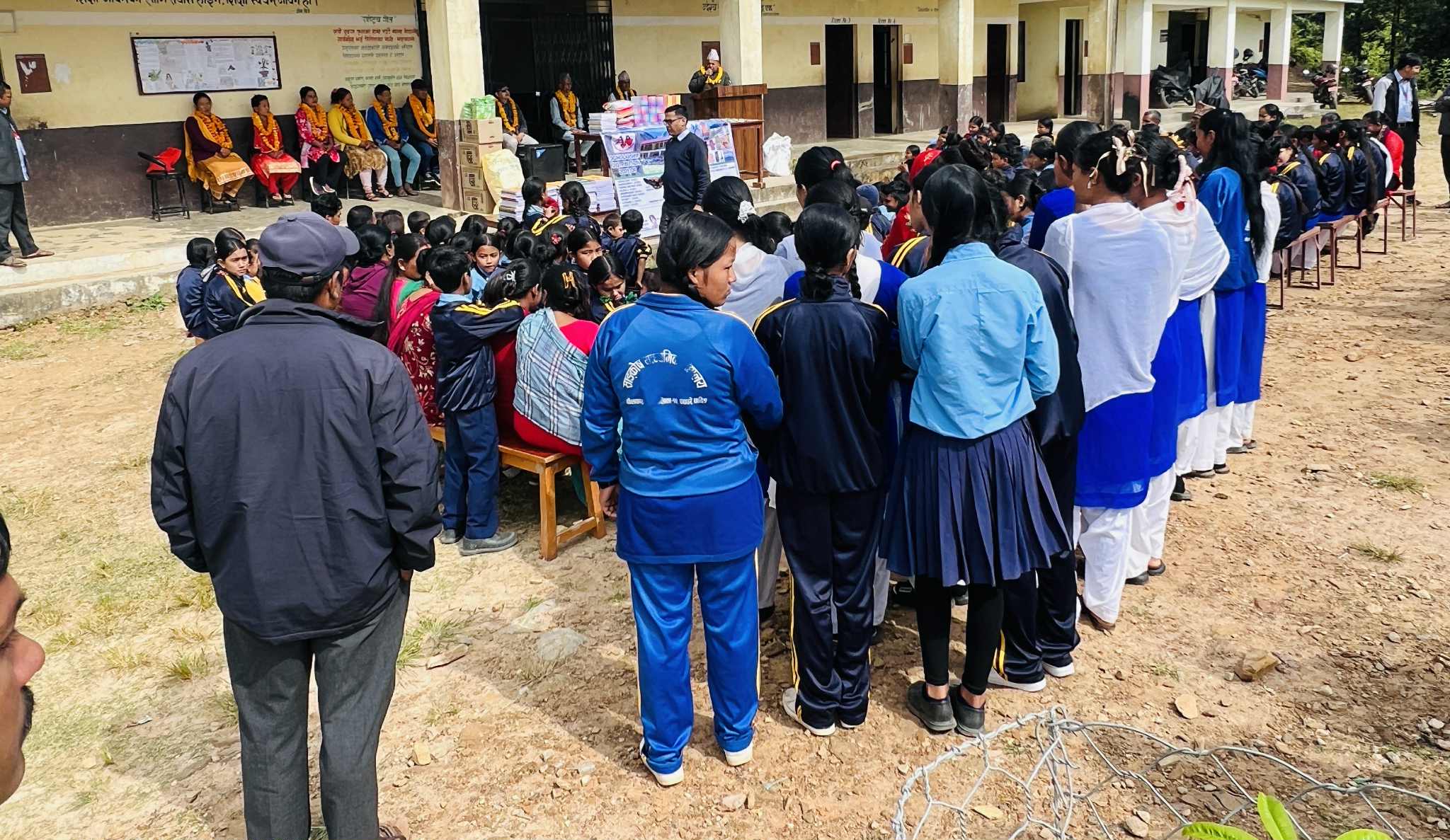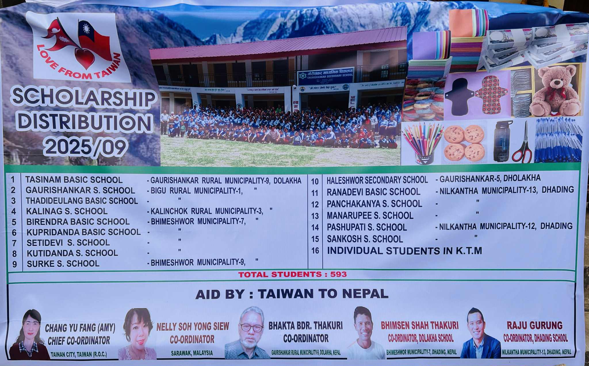 नेपाली कांग्रेस धादिङका जिल्ला सदस्य एवं Trekking Agencies’ Association of Nepal (TAAN) का केन्द्रीय सदस्य, सफल पर्यटन व्यवसायी तथा शिक्षाप्रेमी समाजसेवी राजु गुरुङ र ताइवानी नागरिक मिस चाङ यु फाङ (Amy)को संयोजनमा विद्यालयमा अध्ययनरत जेहेन्दार तथा विपन्न विद्यार्थीहरूलाई नगदसहित शैक्षिक सामग्री वितरण गरिएको बिद्यालयका शिक्षक सुरेश अर्यालले जानकारी दिनुभयो ।